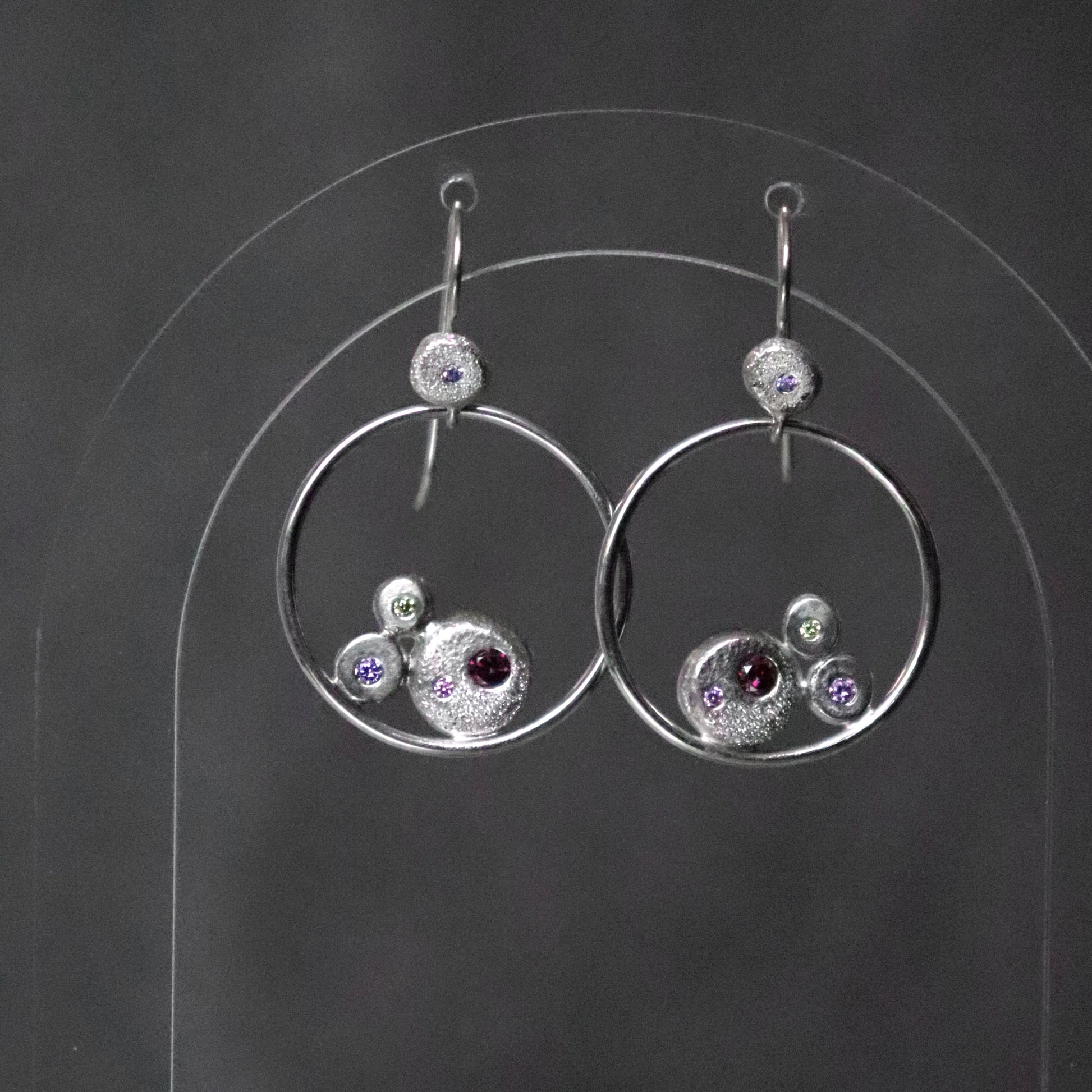 Perfect for those who appreciate jewellery with character and subtle surprises, these earrings are made from recycled sterling silver and crafted with thoughtful details. Polished hoops hold three molten silver pebbles, each flush-set with colourful cubic zirconia. The largest stones in magenta subtly draw the eye, shifting from plum to garnet red with flashes of violet and purple, while smaller stones in lime green, purple, and rose pink add gentle pops of colour.