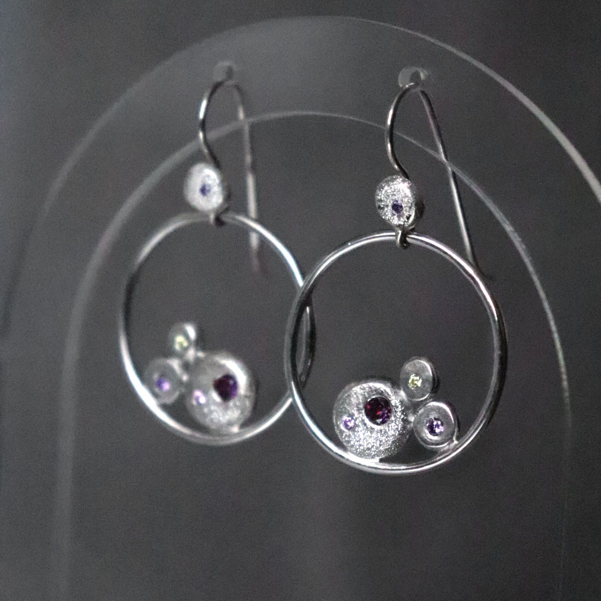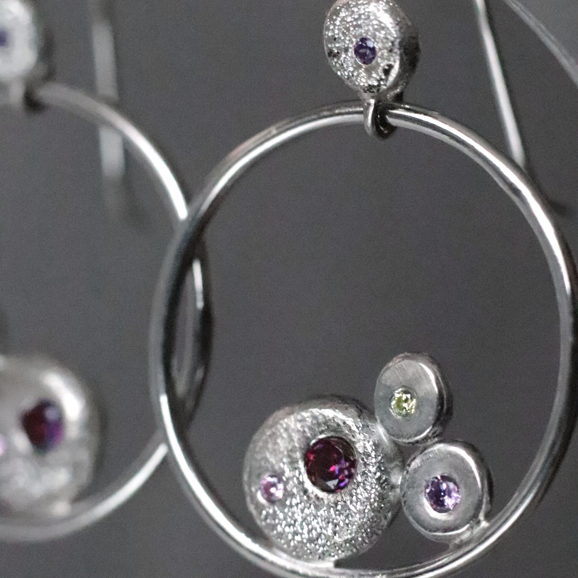 Dangly Hoop Earrings with Silver Pebbles and Colourful Cubic Zirconia