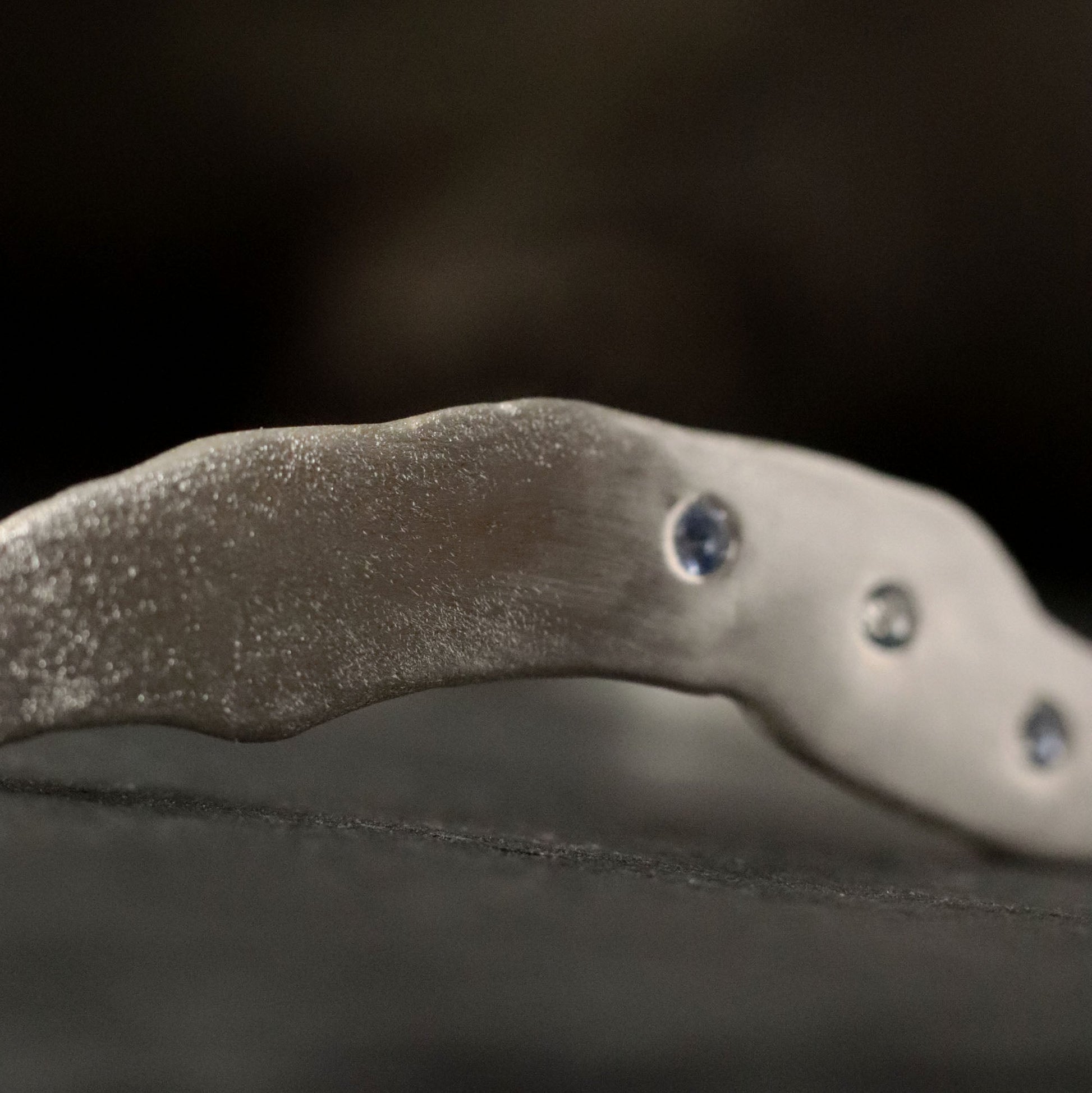 Set with three tiny 2mm light blue sapphires, celebrated for wisdom, protection, and serenity, and also the birthstone for September and a traditional 45th wedding anniversary gift, giving this piece added meaning.