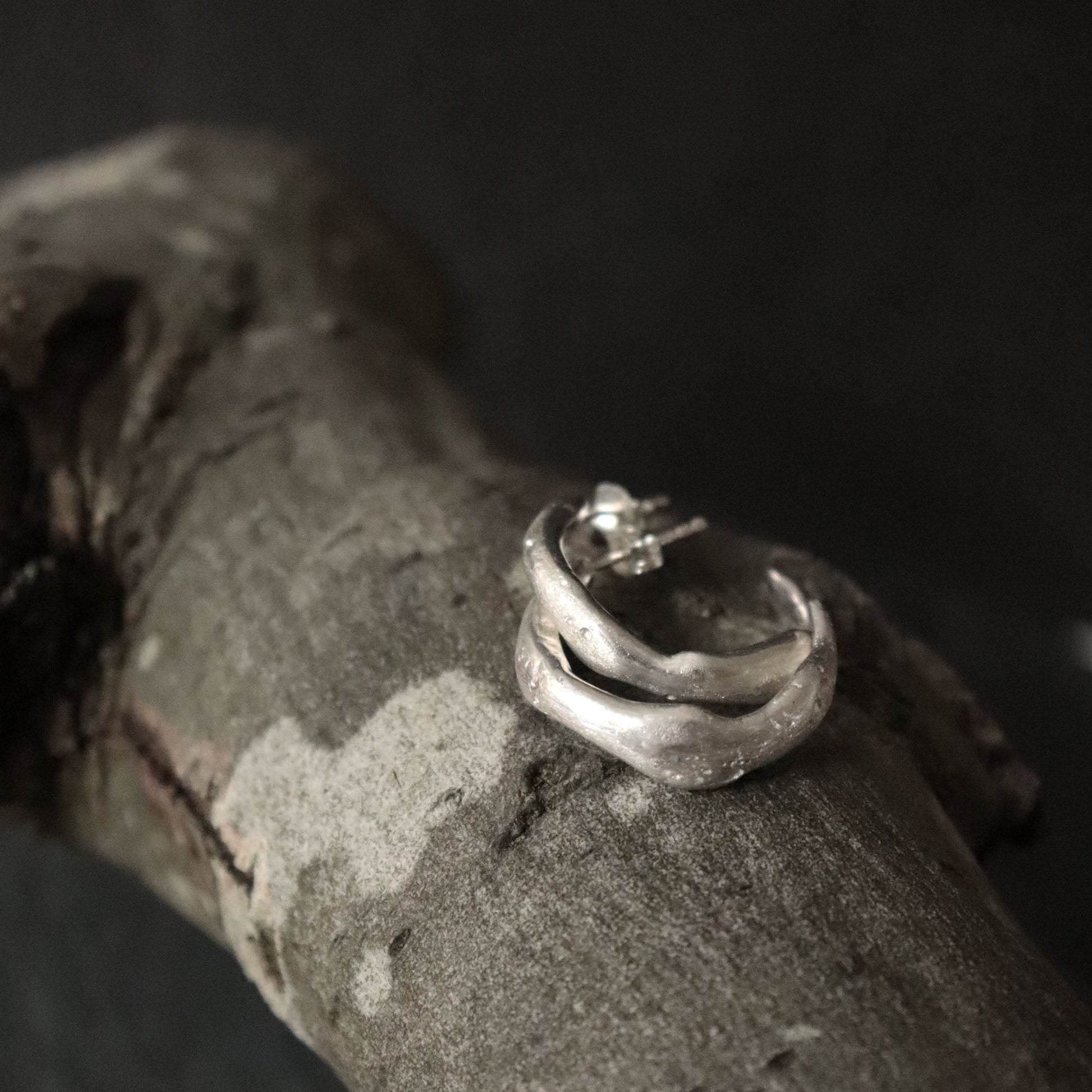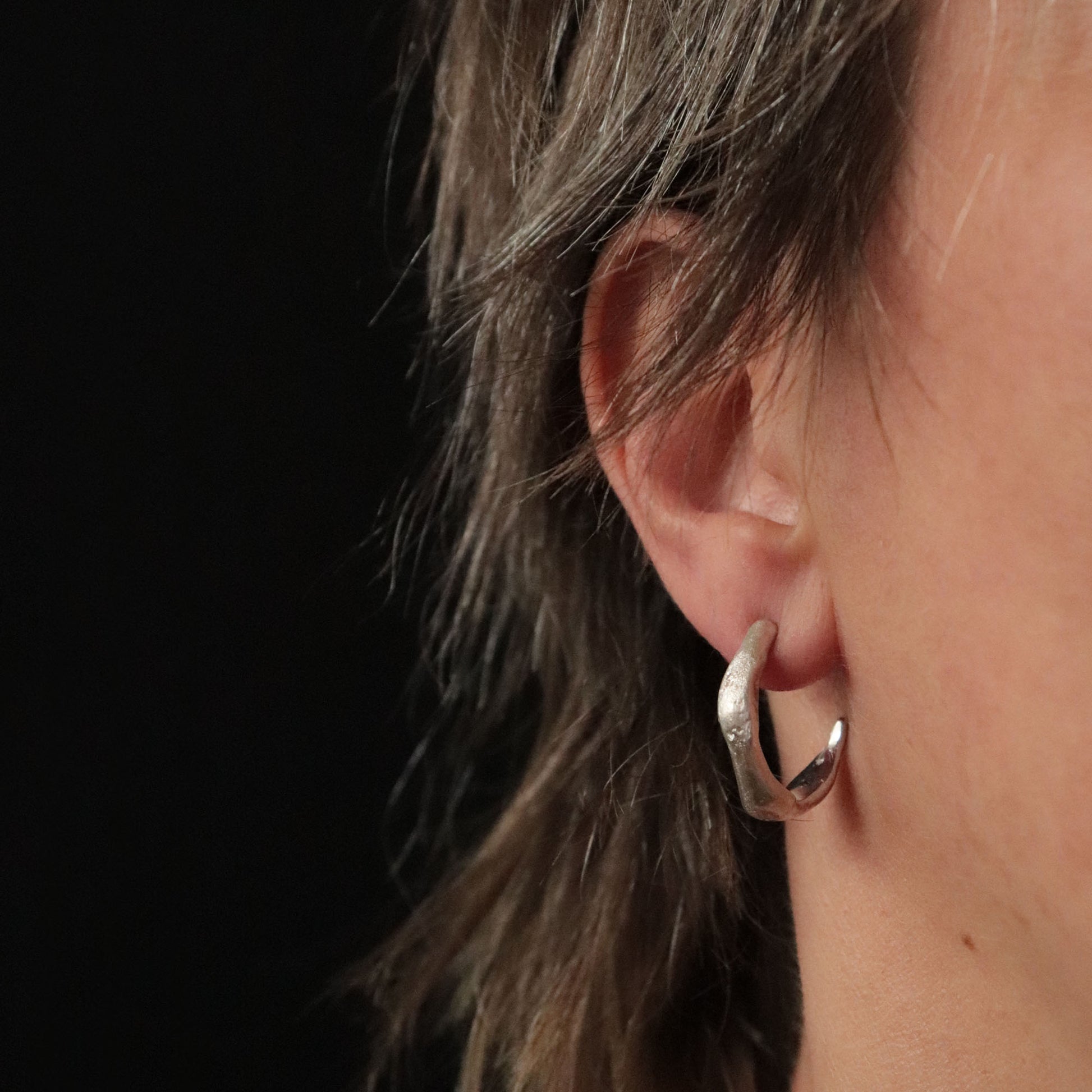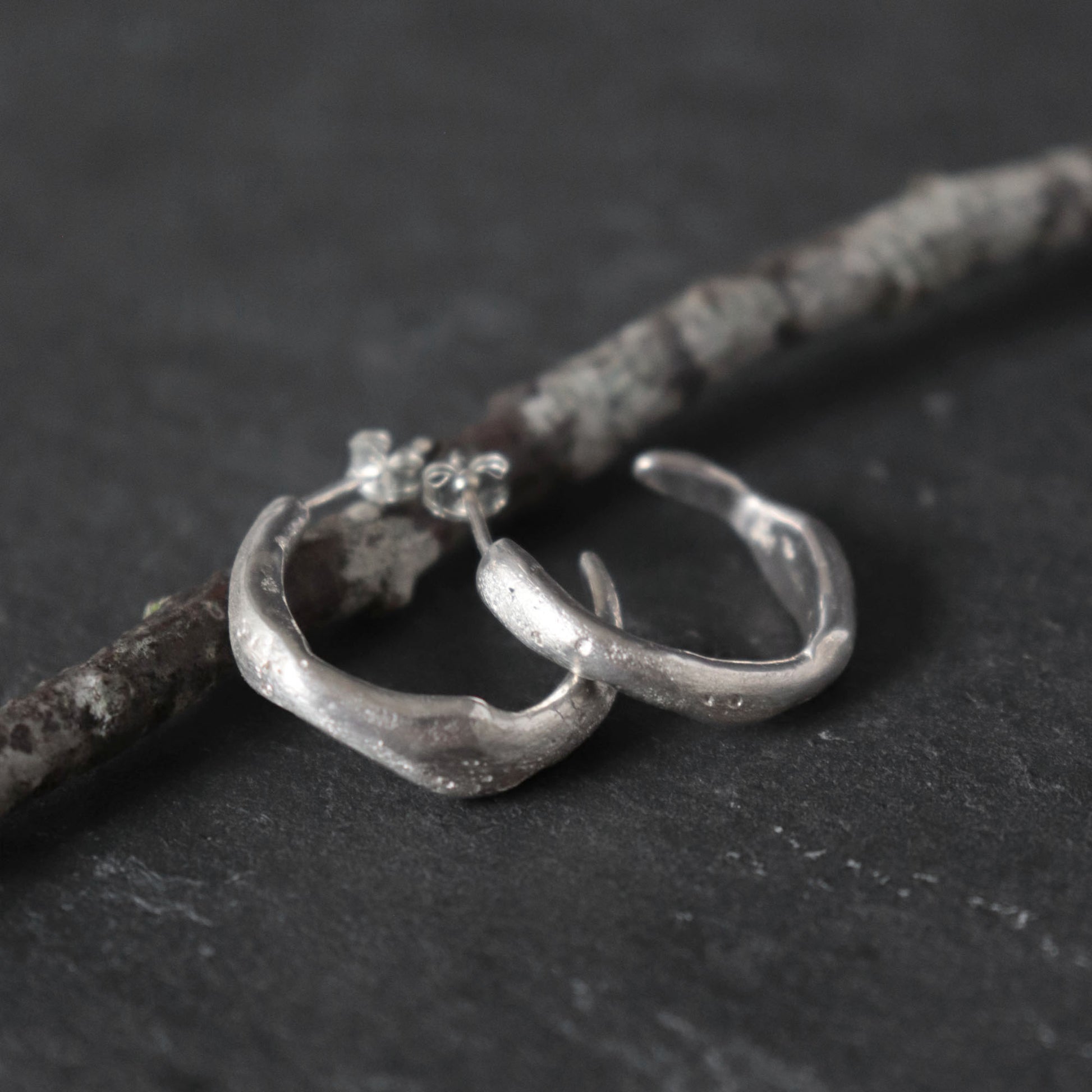 Handcrafted from recycled molten sterling silver, these semi hoop stud earrings have an organic, irregular shape that makes each pair truly unique. Textured in places and finished with a soft mix of satin and frosted surfaces, they catch the light beautifully while keeping a subtle, natural look.