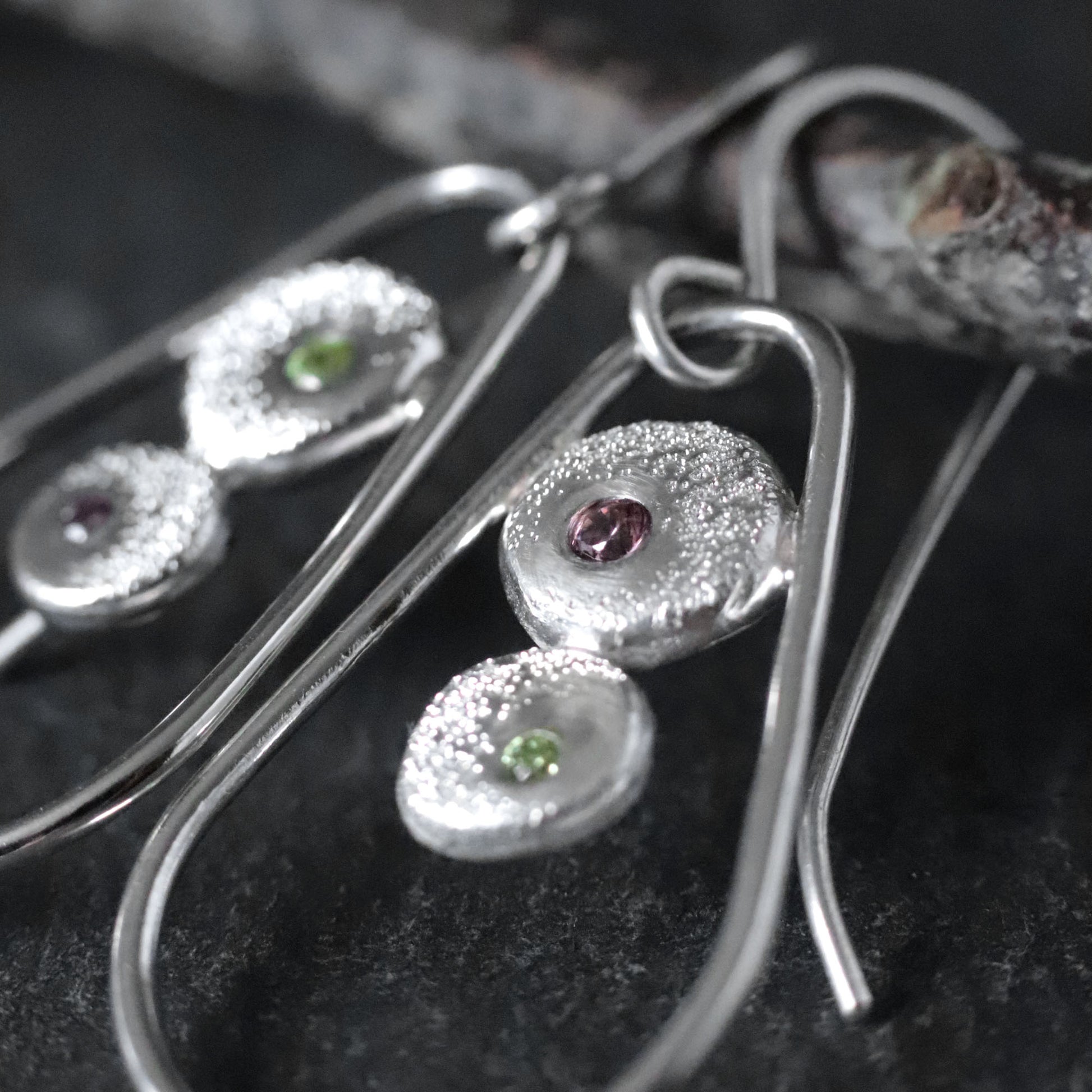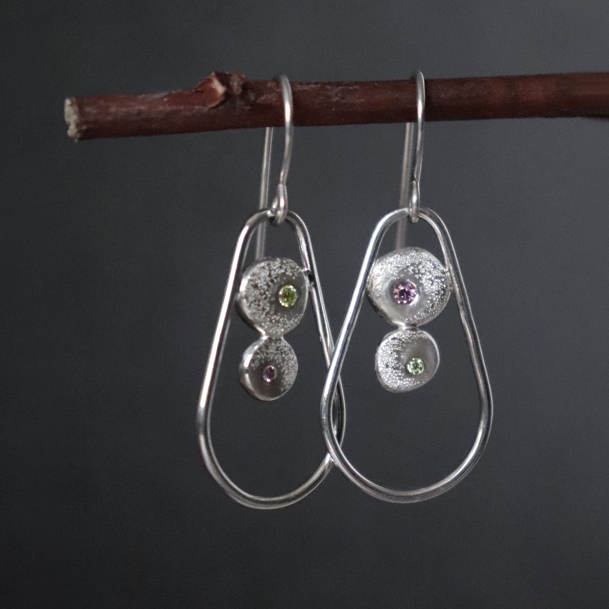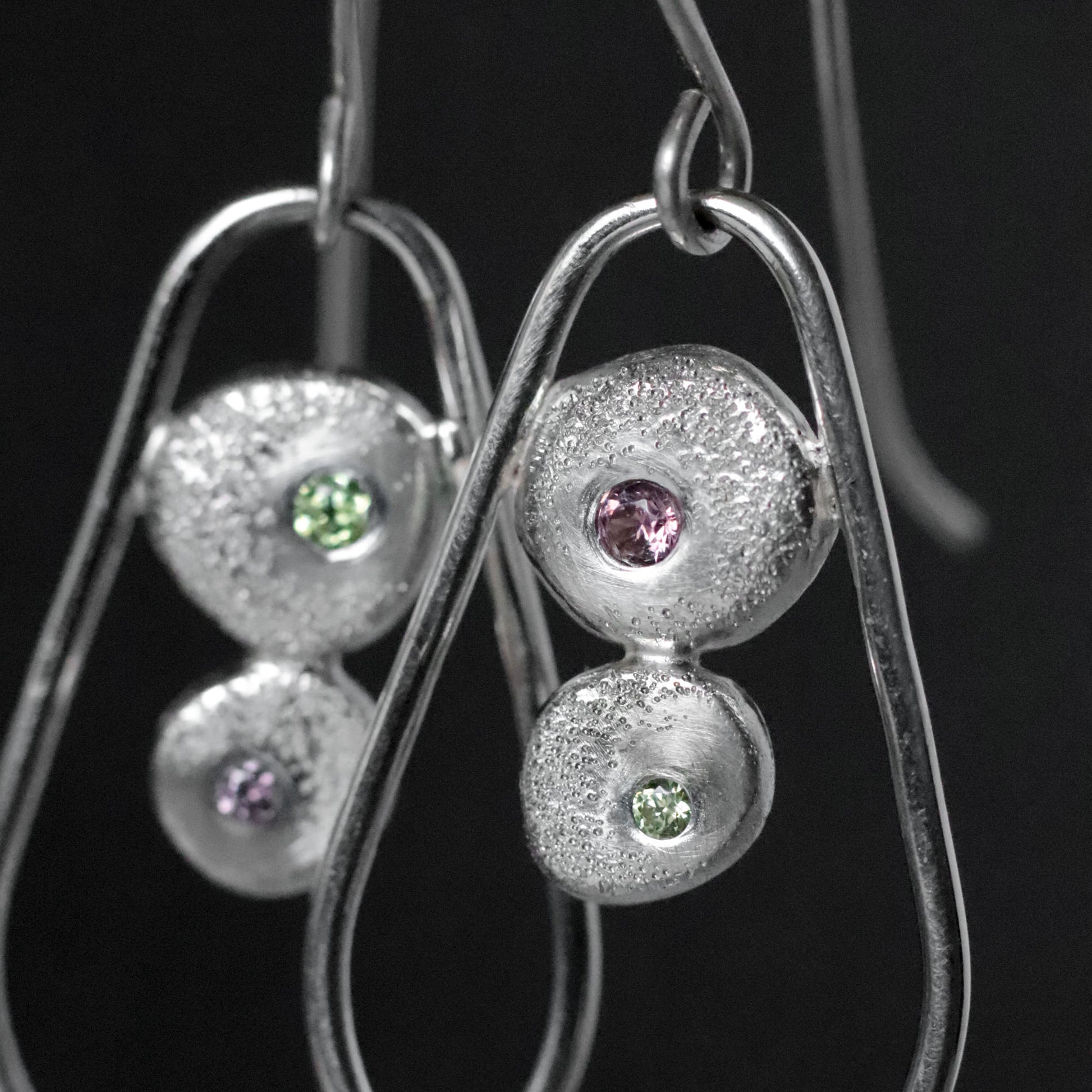 Tiny flush-set cubic zirconia (2mm and 1.5mm) in lime green and plum-rose pink add a soft, cheerful sparkle. One earring has the green stone at the top and pink at the bottom; the other is reversed, giving a subtle, balanced asymmetry.